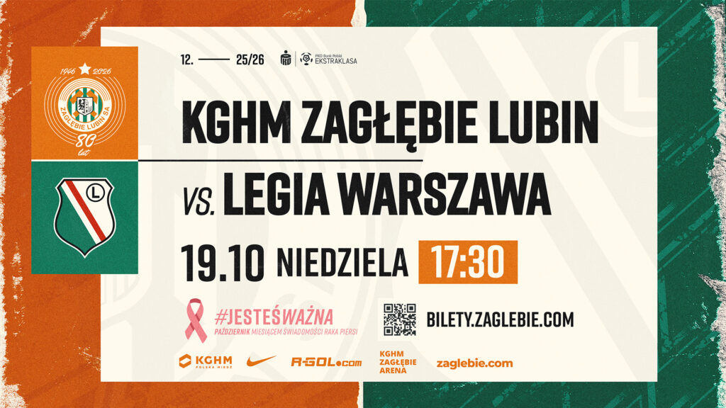 Już w niedzielę, 19 października o godzinie 17:30, KGHM Zagłębie Lubin podejmie Legię Warszawa w ramach 12. kolejki PKO BP Ekstraklasy. To spotkanie zapowiada się wyjątkowo – trybuny KGHM Zagłębie Areny mogą wypełnić się do ostatniego miejsca!