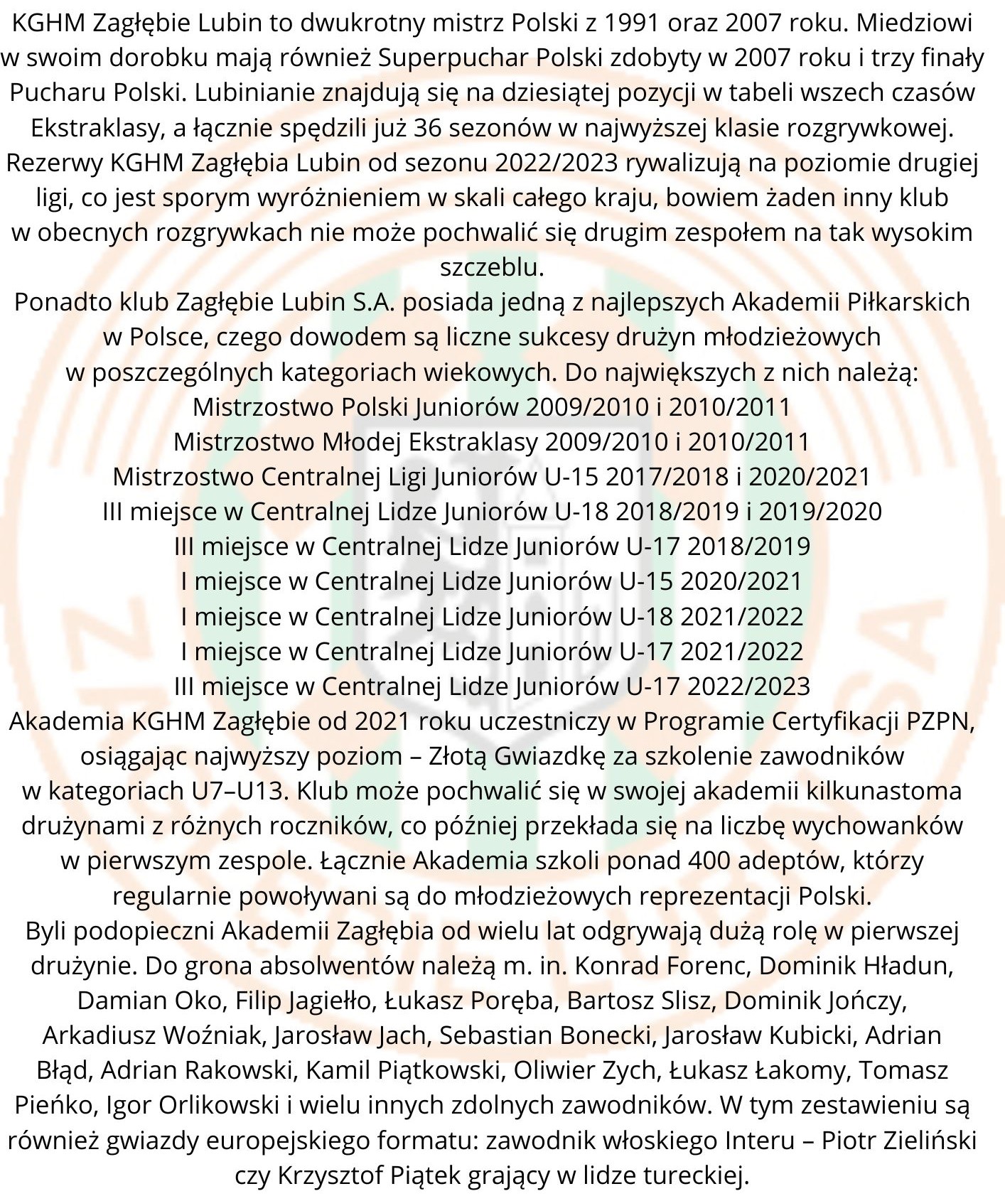 Zagłębie Lubin S.A. to klub z bogatą tradycją, dwukrotny mistrz Polski, nierozerwalnie związany z historią i tożsamością Zagłębia Miedziowego. Współpraca klubu z organizacjami zrzeszającymi pracowników KGHM otwiera nowe możliwości dotarcia do szerokiego grona kibiców, zarówno tych, którzy już od lat wspierają Klub, jak i tych, którzy mogą stać się częścią tej społeczności.