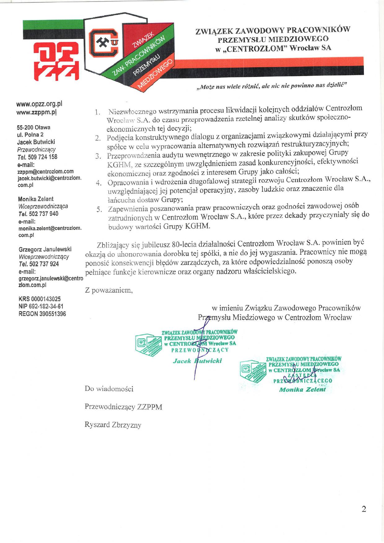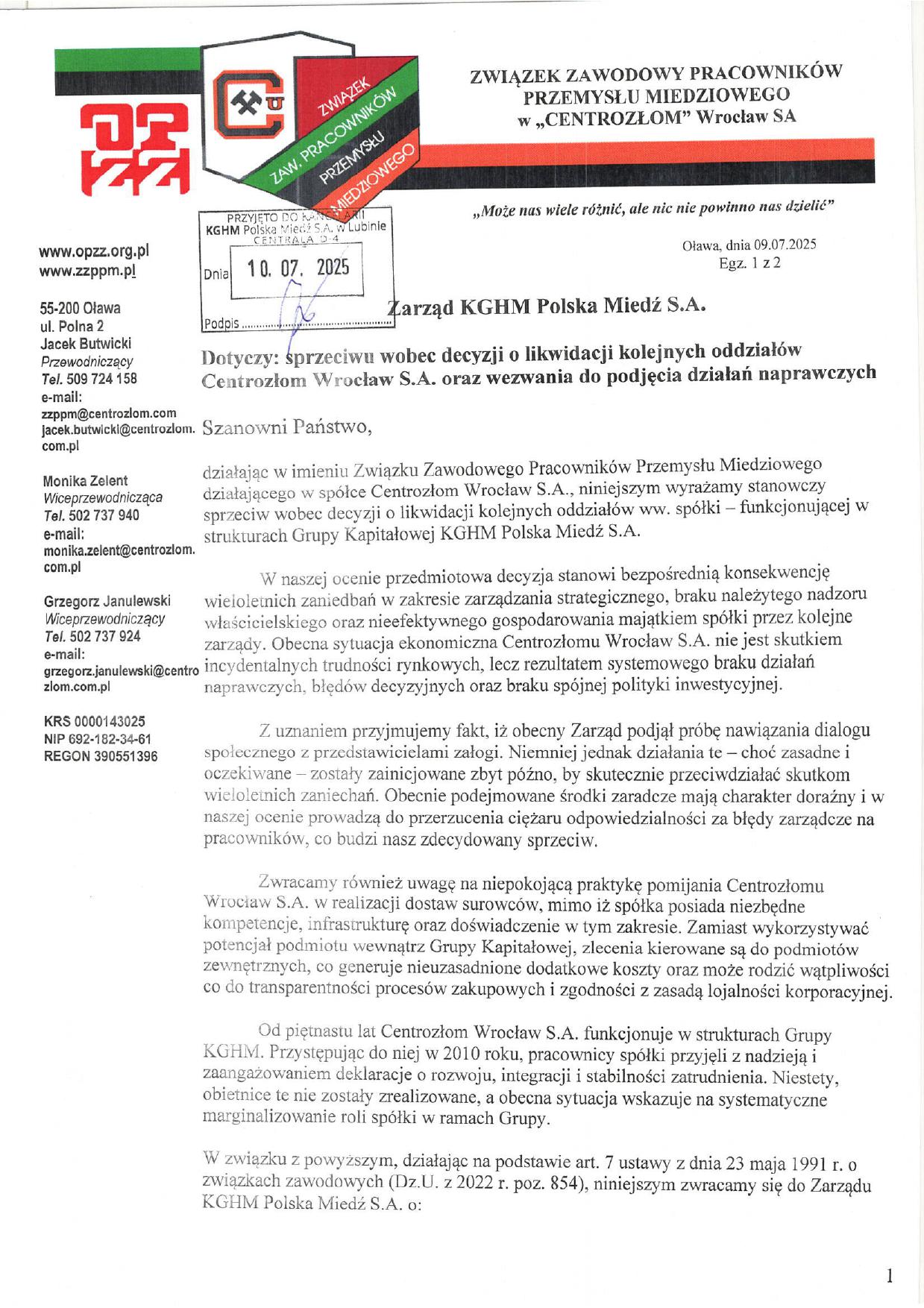 Związek Zawodowy Pracowników Przemysłu Miedziowego wystosował zdecydowany sprzeciw wobec decyzji o likwidacji kolejnych oddziałów spółki Centrozłom Wrocław S.A., należącej do Grupy Kapitałowej KGHM. W swoim apelu wskazuje na wieloletnie błędy zarządcze, marginalizację spółki oraz ignorowanie jej potencjału w realizacji dostaw.
