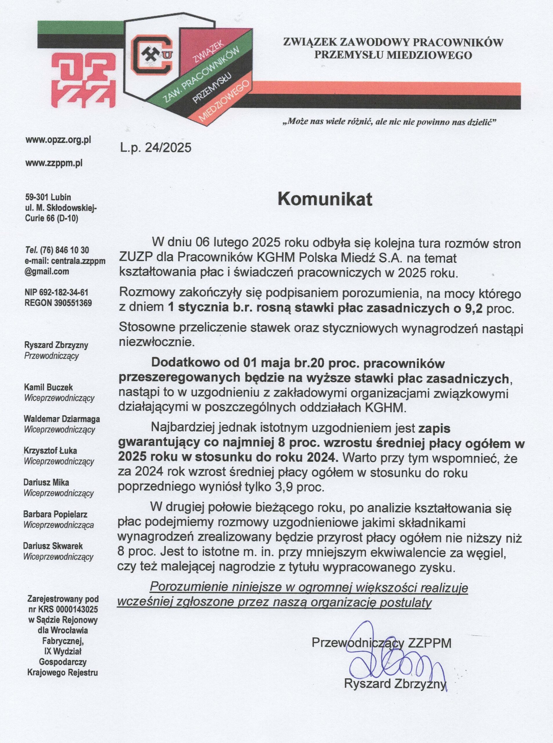 MZZPD KGHM udziela poparcia Ryszardowi Zbrzyznemu w wyborach do Rady Nadzorczej