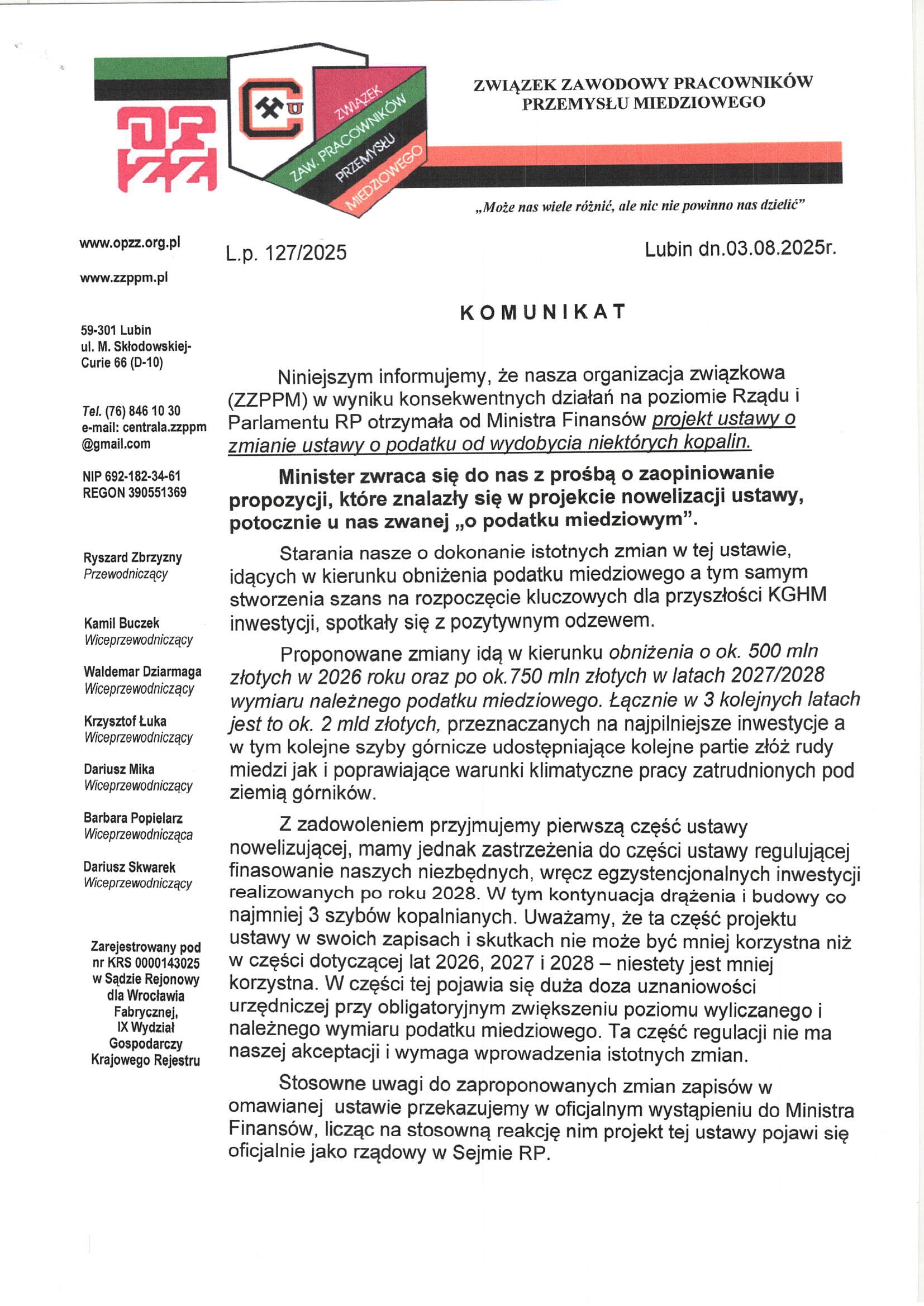 Z zadowoleniem przyjmujemy pierwszą część ustawy nowelizującej, mamy jednak zastrzeżenia do części ustawy regulującej finasowanie naszych niezbędnych, wręcz egzystencjonalnych inwestycji realizowanych po roku 2028. W tym kontynuacja drążenia i budowy co najmniej 3 szybów kopalnianych. Uważamy, że ta część projektu ustawy w swoich zapisach i skutkach nie może być mniej korzystna niż w części dotyczącej lat 2026, 2027 i 2028 – niestety jest mniej korzystna. W części tej pojawia się duża doza uznaniowości urzędniczej przy obligatoryjnym zwiększeniu poziomu wyliczanego i należnego wymiaru podatku miedziowego. Ta część regulacji nie ma naszej akceptacji i wymaga wprowadzenia istotnych zmian. Stosowne uwagi do zaproponowanych zmian zapisów w omawianej ustawie przekazujemy w oficjalnym wystąpieniu do Ministra Finansów, licząc na stosowną reakcję nim projekt tej ustawy pojawi się oficjalnie jako rządowy w Sejmie RP. Oceniając zaistniałą sytuację należy docenić, że w końcu zauważono, że eksploatacja posiadanych zasobów rud miedzi rodzi szereg pozytywnych konsekwencji nie tylko dla władz centralnych, a także dla społeczności lokalnych, rozwoju regionalnego, tworzeniu dobrych miejsc pracy, a także istotnego wzrostu dochodów gmin.