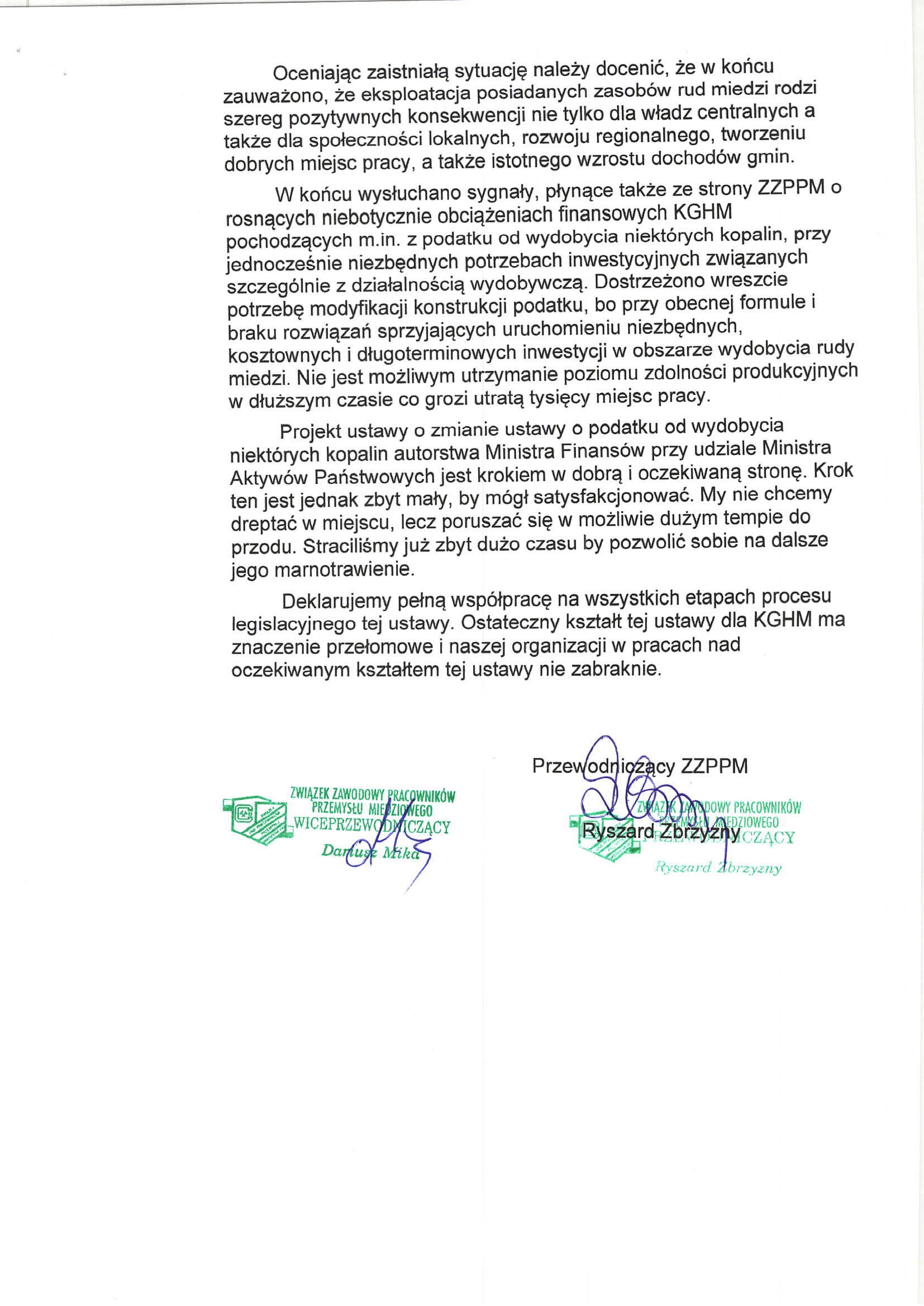 W końcu wysłuchano sygnały, płynące także ze strony ZZPPM o rosnących niebotycznie obciążeniach finansowych KGHM pochodzących m.in. z podatku od wydobycia niektórych kopalin, przy jednocześnie niezbędnych potrzebach inwestycyjnych związanych szczególnie z działalnością wydobywczą. Dostrzeżono wreszcie potrzebę modyfikacji konstrukcji podatku, bo przy obecnej formule i braku rozwiązań sprzyjających uruchomieniu niezbędnych, kosztownych i długoterminowych inwestycji w obszarze wydobycia rudy miedzi. Nie jest możliwym utrzymanie poziomu zdolności produkcyjnych w dłuższym czasie co grozi utratą tysięcy miejsc pracy.