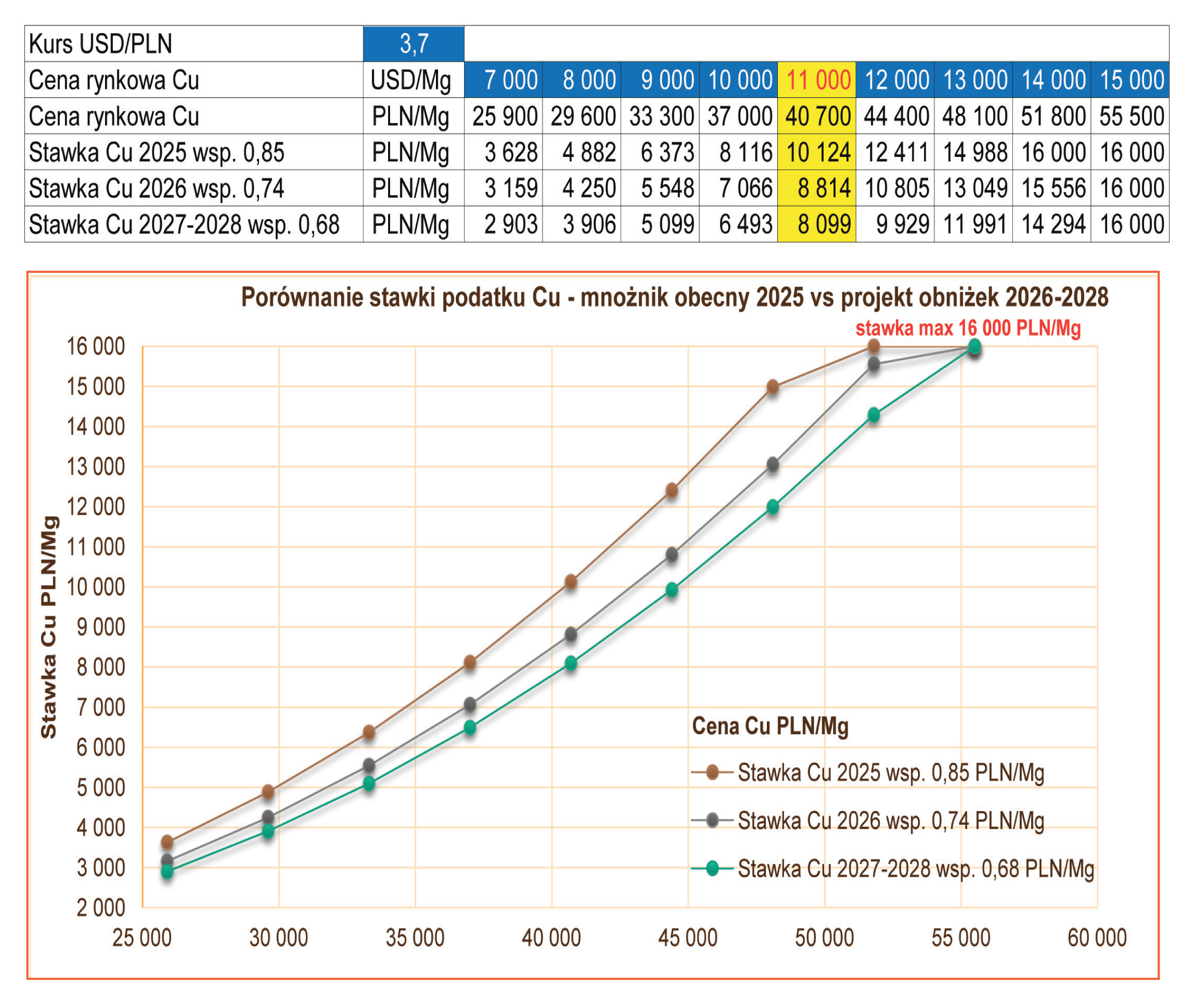 - Efekt konkurencyjności – redukcja podatku poprawi relatywną, bardzo niekorzystną pozycję kosztową Polskiej Miedzi na tle globalnych producentów, co jest istotne w warunkach wysokiej zmienności cen surowców na rynkach światowych.